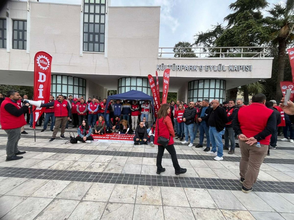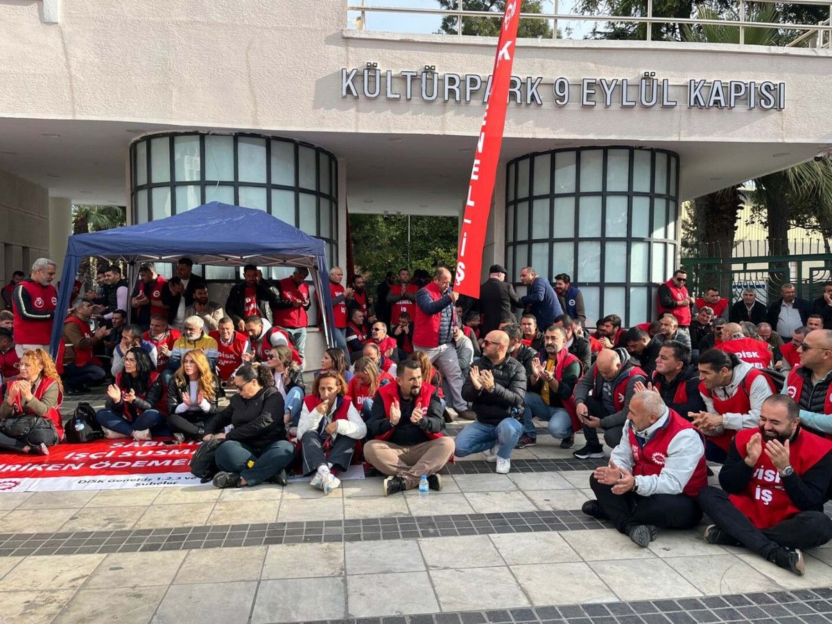 Açıklamanın ardından bir süre oturma eylemi yapan işçiler, daha sonra Kültürpark’ın 9 Eylül kapısına yürüyerek, oturma eylemine orada devam etti.