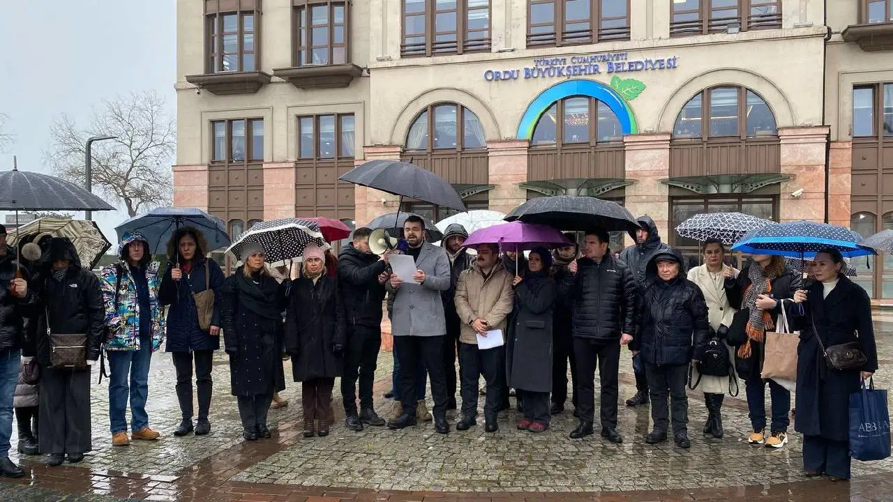 Üyeler, Kültürpark’taki İzmir Büyükşehir Belediyesi Hizmet Binası önünde bir araya gelerek basın açıklaması yaptı.
